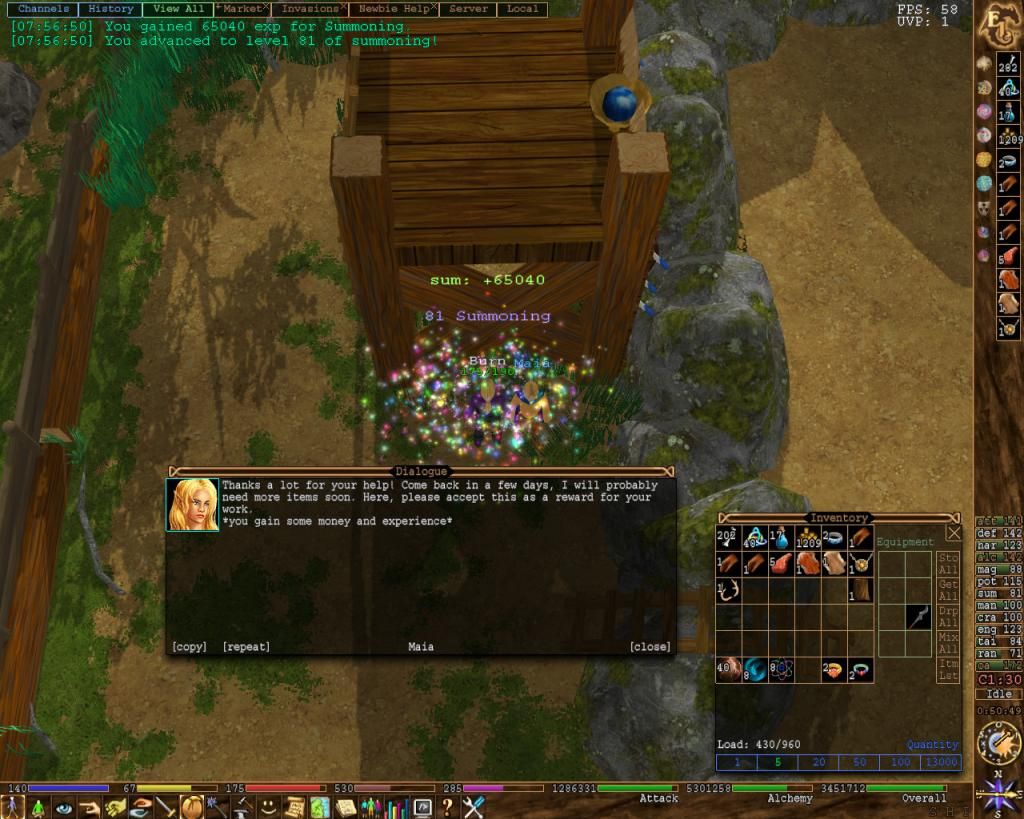 Summoning has been hit a bit on summoning days, though the levels have been hit while turning in the daily. Keeping a nice heavy stock of every item wanted for that, enough for 10 days worth of each fur and such. Two more levels since last update.